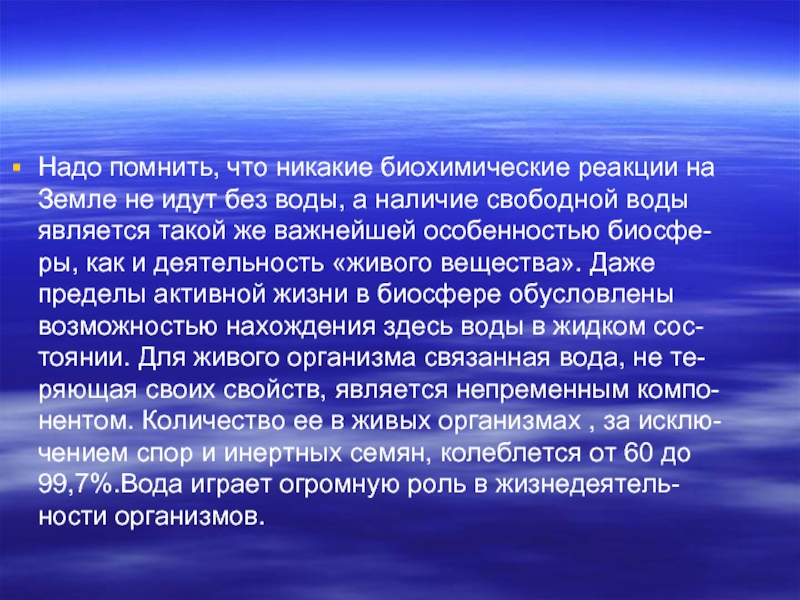 воды, а наличие свободной воды является такой же важнейшей особенностью биосфе-ры, как и деятельность «живого вещества». Даже пределы активной жизни в биосфере обусловлены возможностью нахождения здесь воды в жидком сос-тоянии. Для живого организма связанная вода, не те-ряющая своих свойств, является непременным компо-нентом. Количество ее в живых организмах , за исклю-чением спор и инертных семян, колеблется от 60 до 99,7%.Вода играет огромную роль в жизнедеятель-ности организмов.