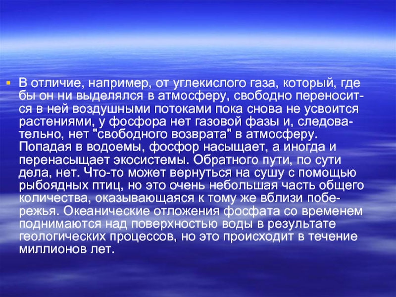 выделялся в атмосферу, свободно переносит-ся в ней воздушными потоками пока снова не усвоится растениями, у фосфора нет газовой фазы и, следова-тельно, нет "свободного возврата" в атмосферу. Попадая в водоемы, фосфор насыщает, а иногда и перенасыщает экосистемы. Обратного пути, по сути дела, нет. Что-то может вернуться на сушу с помощью рыбоядных птиц, но это очень небольшая часть общего количества, оказывающаяся к тому же вблизи побе-режья. Океанические отложения фосфата со временем поднимаются над поверхностью воды в результате геологических процессов, но это происходит в течение миллионов лет.