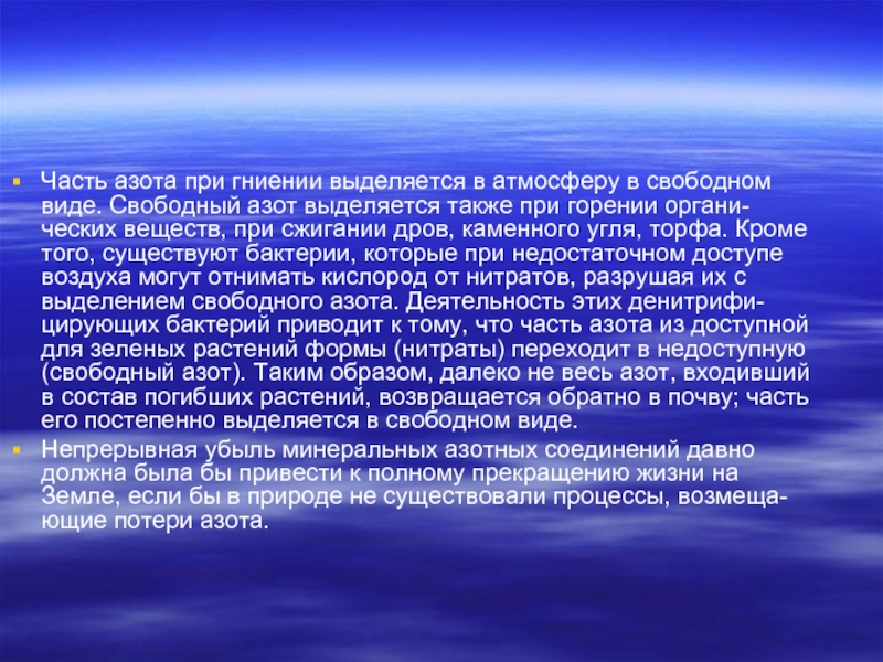 Слайд 27Часть азота при гниении выделяется в атмосферу в свободном виде. Свободный