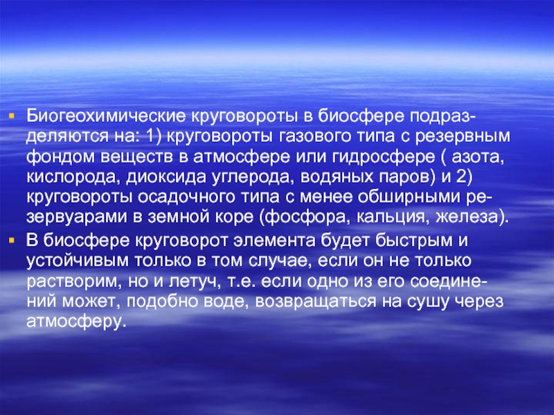 В биосфере круговорот элемента будет быстрым и устойчивым только в том случае, если он не только растворим, но и летуч, т.е. если одно из его соедине-ний может, подобно воде, возвращаться на сушу через атмосферу.