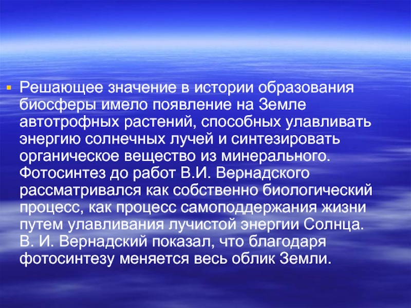 растений, способных улавливать энергию солнечных лучей и синтезировать органическое вещество из минерального. Фотосинтез до работ В.И. Вернадского рассматривался как собственно биологический процесс, как процесс самоподдержания жизни путем улавливания лучистой энергии Солнца. В. И. Вернадский показал, что благодаря фотосинтезу меняется весь облик Земли.