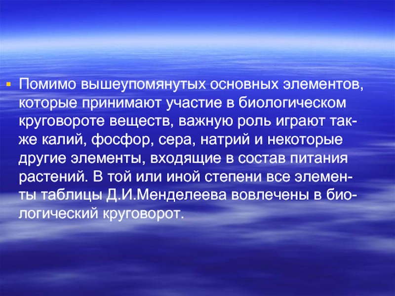 важную роль играют так-же калий, фосфор, сера, натрий и некоторые другие элементы, входящие в состав питания растений. В той или иной степени все элемен-ты таблицы Д.И.Менделеева вовлечены в био-логический круговорот.