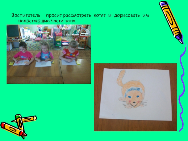 Слайд 11Воспитатель просит рассмотреть котят и дорисовать им недостающие части тела.