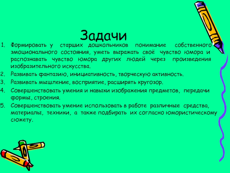 - изображать художественные образы в соответствии с эмоционально-юмористическими чувствами;