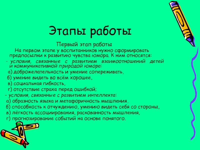 первом этапе у воспитанников нужно сформировать предпосылки к развитию чувства юмора. К ним относятся: