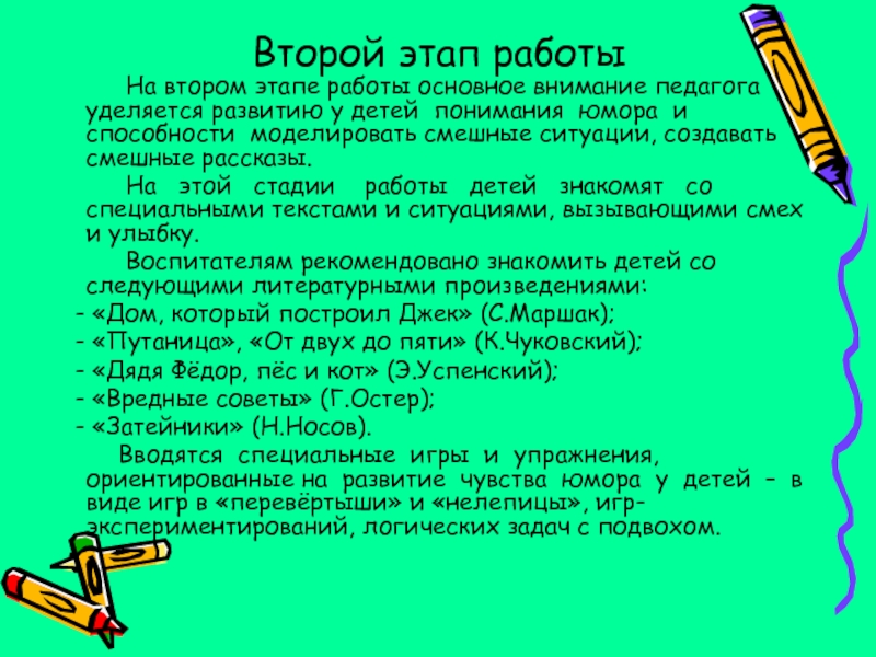 На этой стадии работы детей знакомят со специальными текстами и ситуациями, вызывающими смех и улыбку.