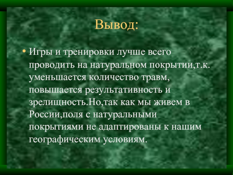 травм,повышается результативность и зрелищность.Но,так как мы живем в России,поля с натуральными покрытиями не адаптированы к нашим географическим условиям.