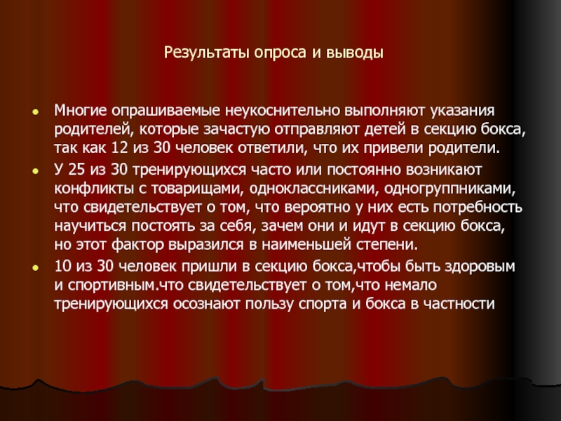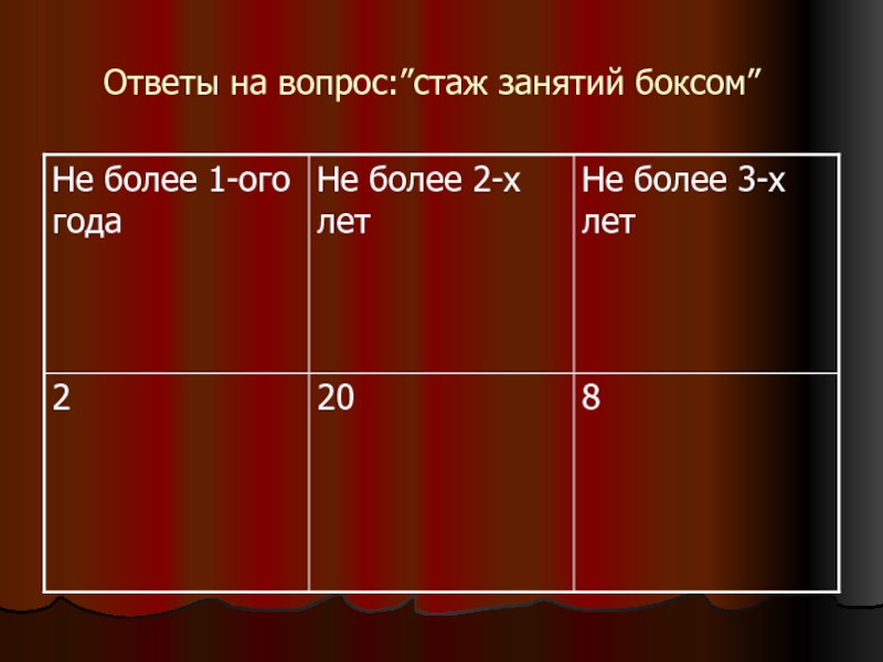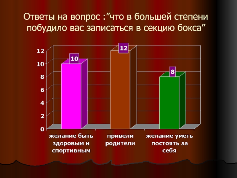 10 из 30 человек пришли в секцию бокса,чтобы быть здоровым и спортивным.что свидетельствует о том,что немало тренирующихся осознают пользу спорта и бокса в частности