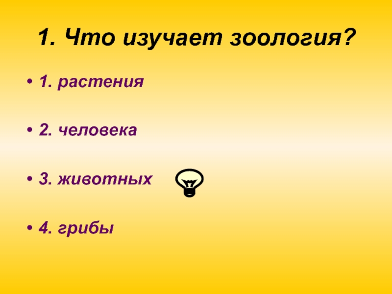 Слайд 201. Что изучает зоология?