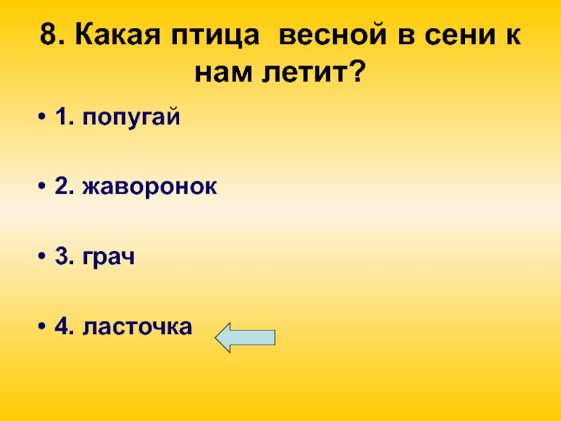 Слайд 448. Какая птица весной в сени к нам летит?