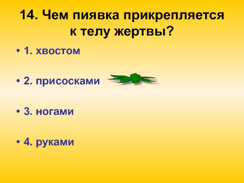 Слайд 1614. Чем пиявка прикрепляется к телу жертвы?