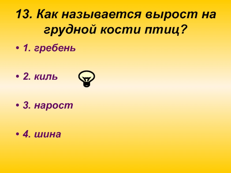 Слайд 3213. Как называется вырост на грудной кости птиц?