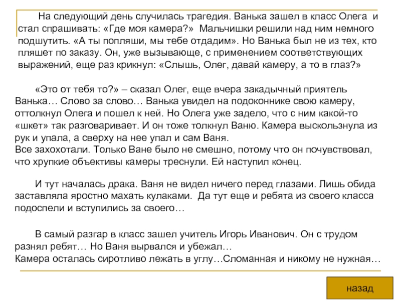 «Это от тебя то?» – сказал Олег, еще вчера закадычный приятель Ванька… Слово за слово… Ванька увидел на подоконнике свою камеру, оттолкнул Олега и пошел к ней. Но Олега уже задело, что с ним какой-то «шкет» так разговаривает. И он тоже толкнул Ваню. Камера выскользнула из рук и упала, а сверху на нее упал и сам Ваня.