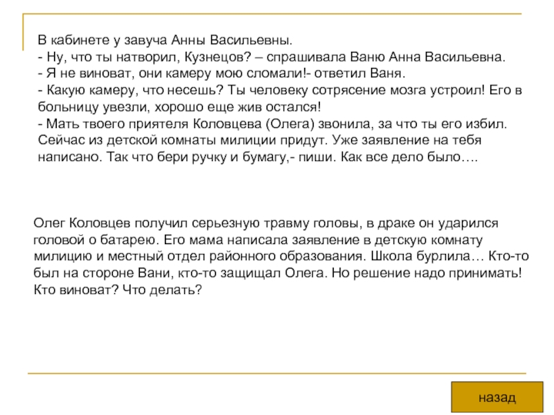 Олег Коловцев получил серьезную травму головы, в драке он ударился головой о батарею. Его мама написала заявление в детскую комнату милицию и местный отдел районного образования. Школа бурлила… Кто-то был на стороне Вани, кто-то защищал Олега. Но решение надо принимать! Кто виноват? Что делать?