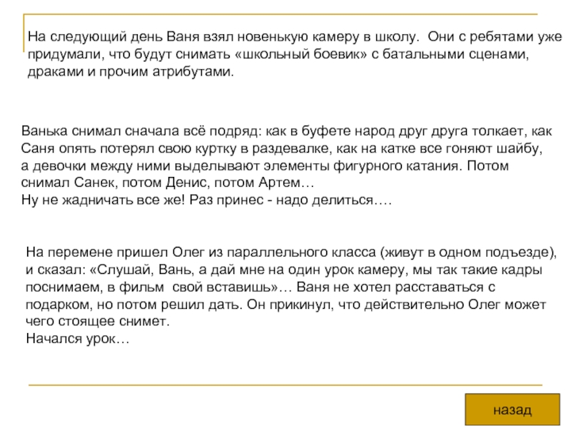 На перемене пришел Олег из параллельного класса (живут в одном подъезде), и сказал: «Слушай, Вань, а дай мне на один урок камеру, мы так такие кадры поснимаем, в фильм свой вставишь»… Ваня не хотел расставаться с подарком, но потом решил дать. Он прикинул, что действительно Олег может чего стоящее снимет.
