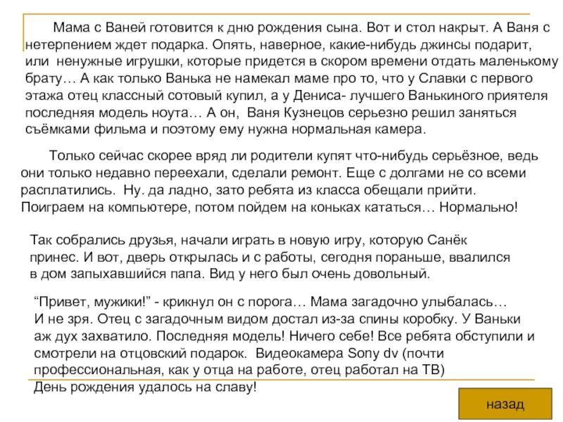 И не зря. Отец с загадочным видом достал из-за спины коробку. У Ваньки аж дух захватило. Последняя модель! Ничего себе! Все ребята обступили и смотрели на отцовский подарок. Видеокамера Sony dv (почти профессиональная, как у отца на работе, отец работал на ТВ)