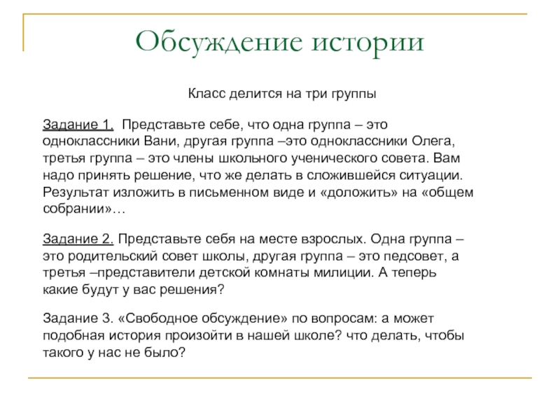 Задание 2. Представьте себя на месте взрослых. Одна группа –это родительский совет школы, другая группа – это педсовет, а третья –представители детской комнаты милиции. А теперь какие будут у вас решения?