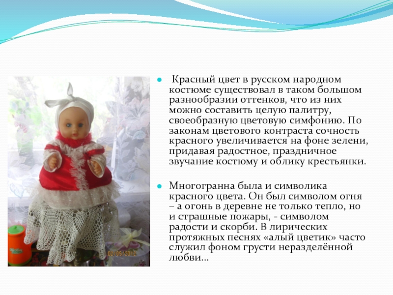 Многогранна была и символика красного цвета. Он был символом огня – а огонь в деревне не только тепло, но и страшные пожары, - символом радости и скорби. В лирических протяжных песнях «алый цветик» часто служил фоном грусти неразделённой любви…