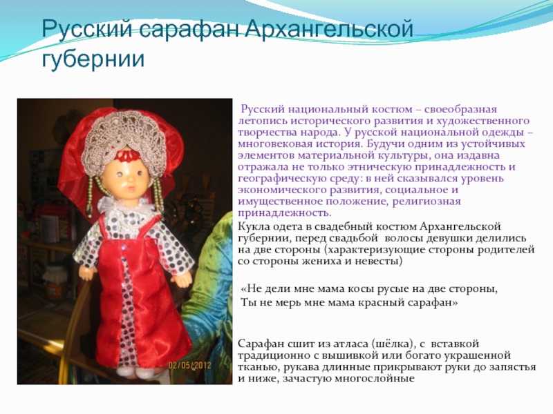 Кукла одета в свадебный костюм Архангельской губернии, перед свадьбой волосы девушки делились на две стороны (характеризующие стороны родителей со стороны жениха и невесты)