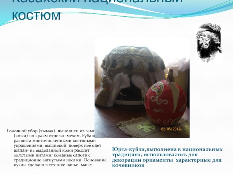 Головной убор (тымак)- выполнен из замши(кожи) по краям отделан мехом. Рубашка расшита многочисленными костяными украшениями, вышивкой; поверх неё одет шапан- из выделанной кожи расшит золотыми нитями; кожаные сапоги с традиционно загнутыми носами. Основание куклы сделано в технике папье- маше