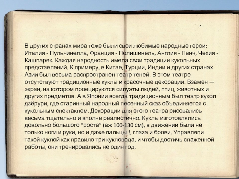 - Пульчинелла, Франция - Полишинель, Англия - Панч, Чехия - Кашпарек. Каждая народность имела свои традиции кукольных представлений. К примеру, в Китае, Турции, Индии и других странах Азии был весьма распространен театр теней. В этом театре отсутствуют традиционные куклы и красочные декорации. Взамен — экран, на котором проецируются силуэты людей, птиц, животных и других предметов. А в Японии всегда традиционным был театр кукол дзёрури, где старинный народный песенный сказ объединяется с кукольным спектаклем. Декорации для этого театра рисовались весьма тщательно и вполне реалистично. Куклы изготовлялись довольно большого “роста” (аж 100-130 см), в движении были не только ноги и руки, но и даже пальцы !, глаза и брови. Управляли такой куклой как правило три кукловода, и чтобы достичь слаженной работы, они тренировались не один год.