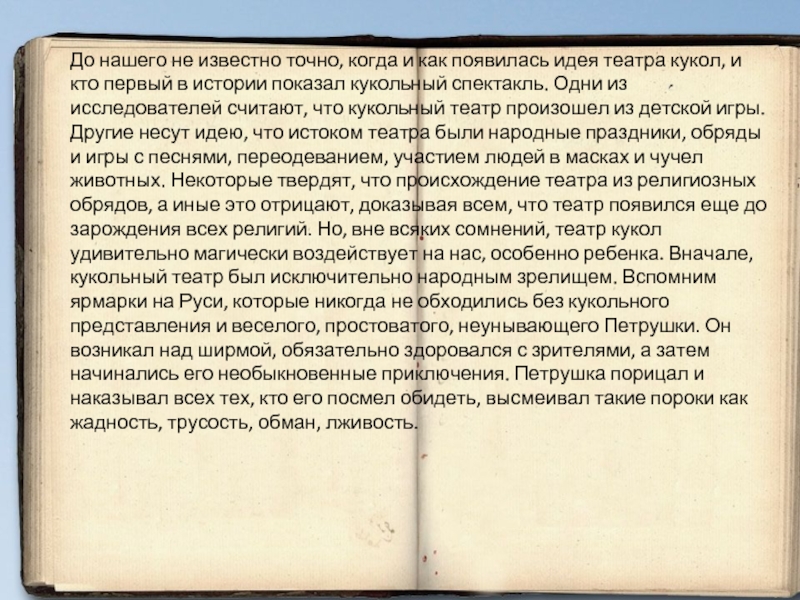 кукол, и кто первый в истории показал кукольный спектакль. Одни из исследователей считают, что кукольный театр произошел из детской игры. Другие несут идею, что истоком театра были народные праздники, обряды и игры с песнями, переодеванием, участием людей в масках и чучел животных. Некоторые твердят, что происхождение театра из религиозных обрядов, а иные это отрицают, доказывая всем, что театр появился еще до зарождения всех религий. Но, вне всяких сомнений, театр кукол удивительно магически воздействует на нас, особенно ребенка. Вначале, кукольный театр был исключительно народным зрелищем. Вспомним ярмарки на Руси, которые никогда не обходились без кукольного представления и веселого, простоватого, неунывающего Петрушки. Он возникал над ширмой, обязательно здоровался с зрителями, а затем начинались его необыкновенные приключения. Петрушка порицал и наказывал всех тех, кто его посмел обидеть, высмеивал такие пороки как жадность, трусость, обман, лживость.