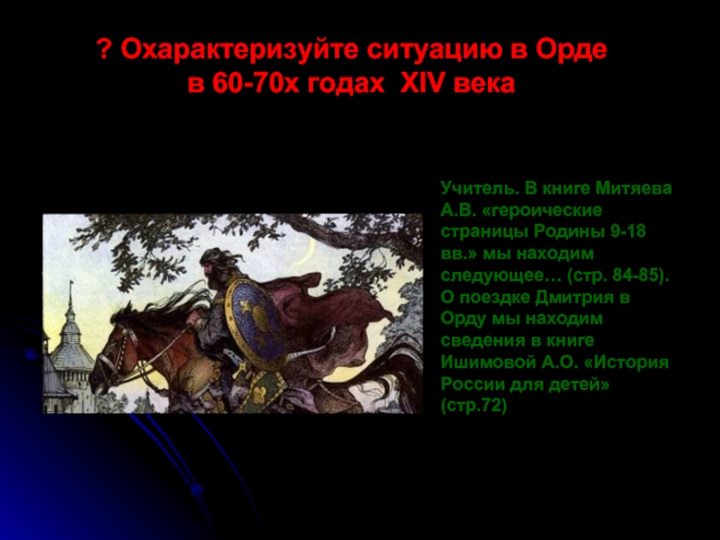 Учитель. В книге Митяева А.В. «героические страницы Родины 9-18 вв.» мы находим следующее… (стр. 81-83)