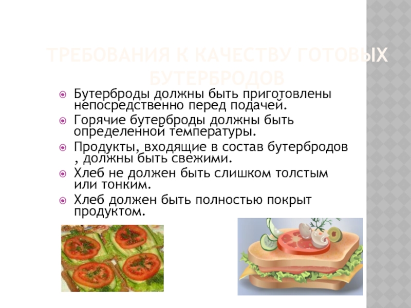 Слайд 7ТРЕБОВАНИЯ К КАЧЕСТВУ ГОТОВЫХ БУТЕРБРОДОВ