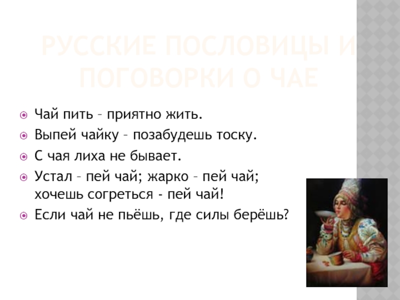 Слайд 13РУССКИЕ ПОСЛОВИЦЫ И ПОГОВОРКИ О ЧАЕ