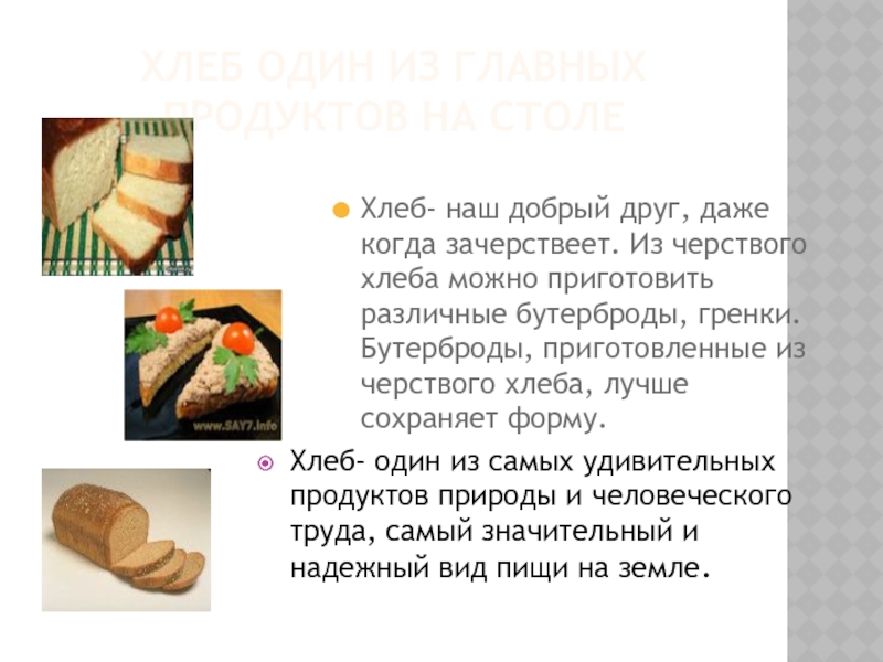 Слайд 4ХЛЕБ ОДИН ИЗ ГЛАВНЫХ ПРОДУКТОВ НА СТОЛЕ
