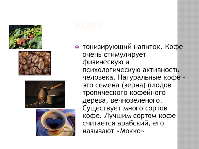 Натуральные кофе – это семена (зерна) плодов тропического кофейного дерева, вечнозеленого. Существует много сортов кофе. Лучшим сортом кофе считается арабский, его называют «Мокко»