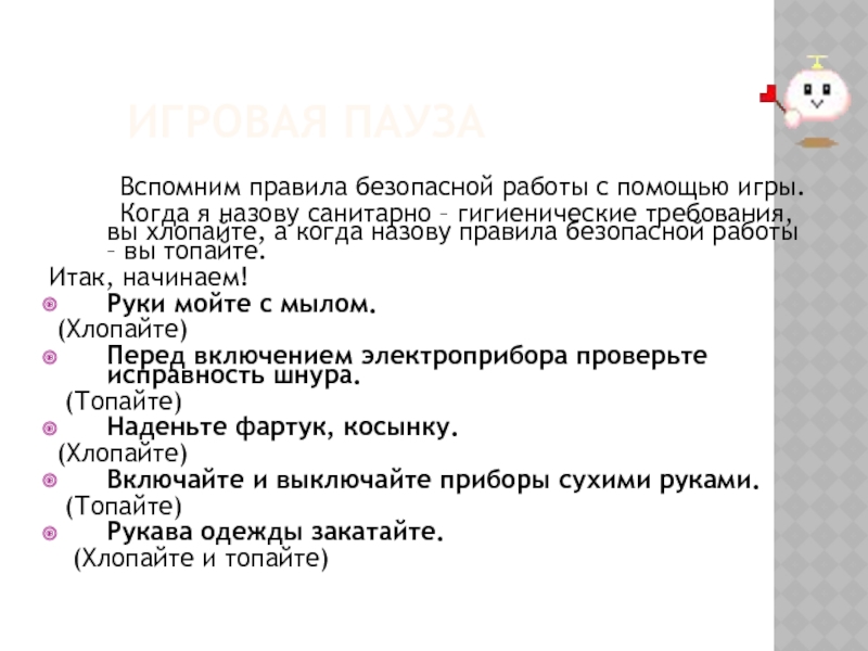 Когда я назову санитарно – гигиенические требования, вы хлопайте, а когда назову правила безопасной работы – вы топайте.