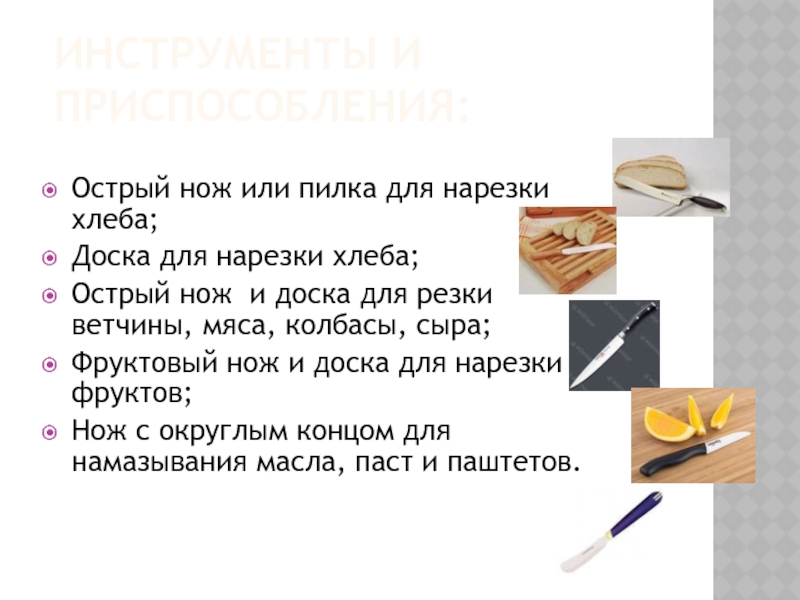 Острый нож и доска для резки ветчины, мяса, колбасы, сыра;