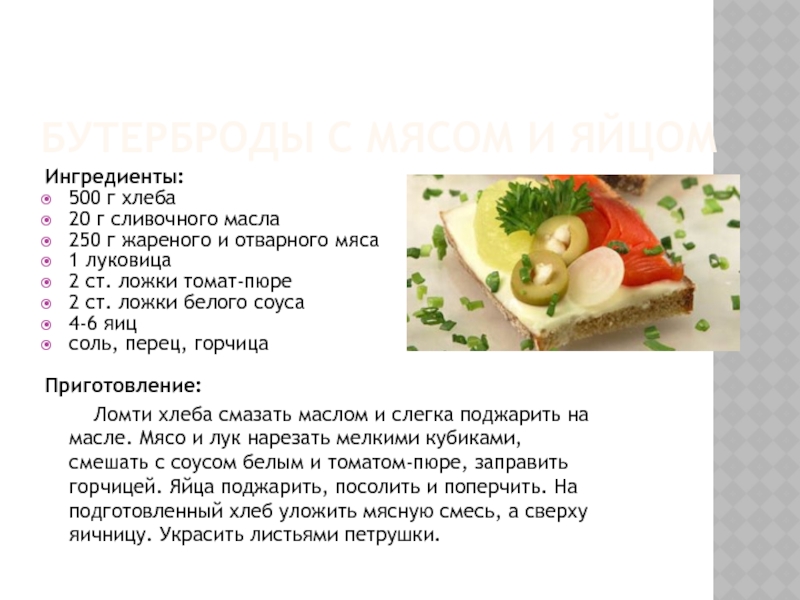Слайд 19БУТЕРБРОДЫ С МЯСОМ И ЯЙЦОМ
