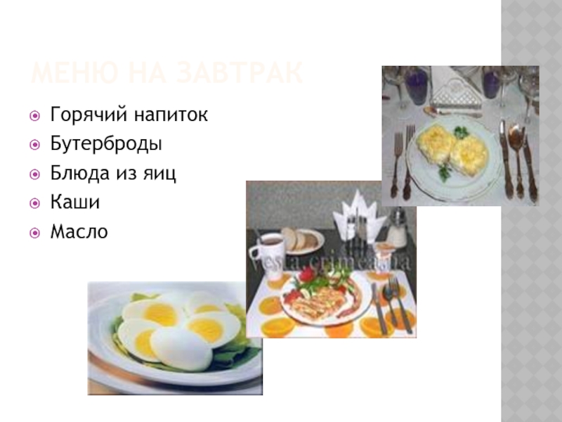 Слайд 3МЕНЮ НА ЗАВТРАК