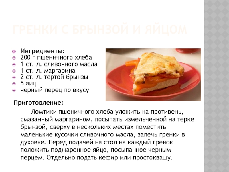 Ломтики пшеничного хлеба уложить на противень, смазанный маргарином, посыпать измельченной на терке брынзой, сверху в нескольких местах поместить маленькие кусочки сливочного масла, запечь гренки в духовке. Перед подачей на стол на каждый гренок положить поджаренное яйцо, посыпанное черным перцем. Отдельно подать кефир или простоквашу.