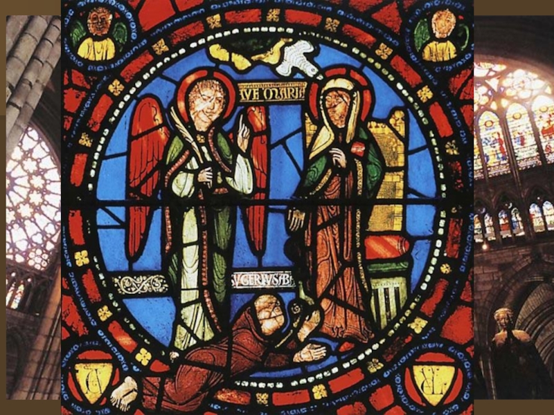 Витраж - живописное полотно из кусочков разноцветного стекла, особую роль играл угол падения света. Цвет придавал непоторимую окраску всему помещению храма. Использовались синие, красные, желтые цвета.