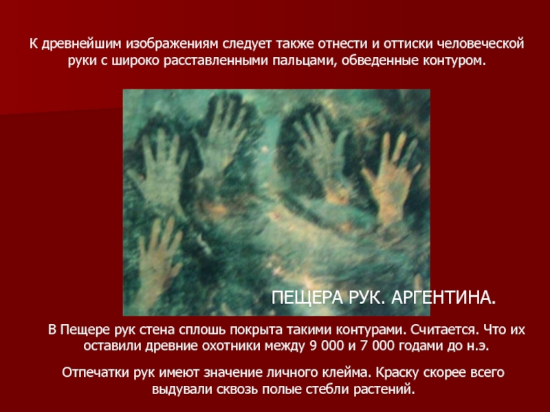К древнейшим изображениям следует также отнести и оттиски человеческой руки с широко расставленными пальцами, обведенные контуром.