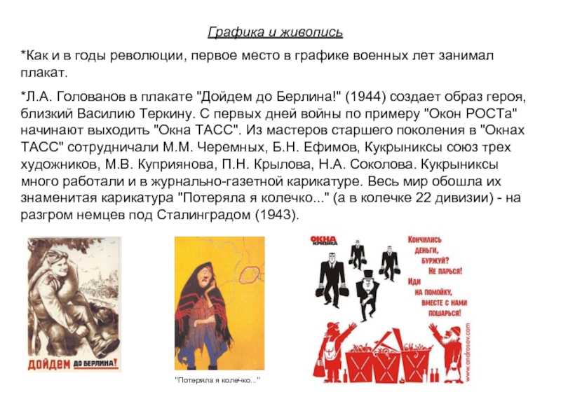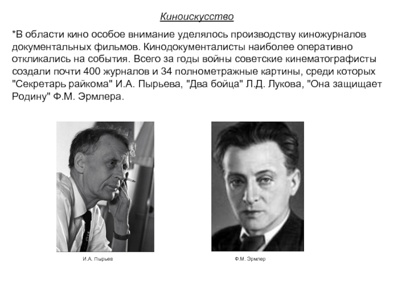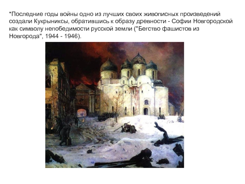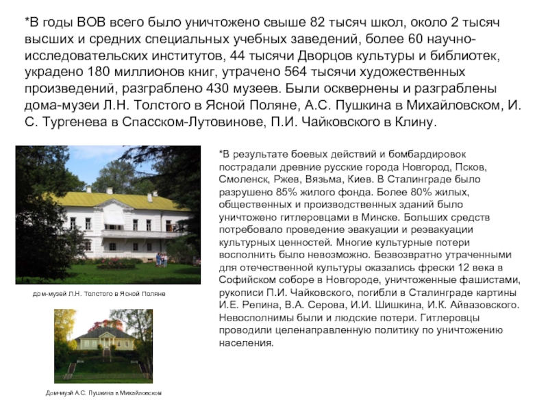 *В результате боевых действий и бомбардировок пострадали древние русские города Новгород, Псков, Смоленск, Ржев, Вязьма, Киев. В Сталинграде было разрушено 85% жилого фонда. Более 80% жилых, общественных и производственных зданий было уничтожено гитлеровцами в Минске. Больших средств потребовало проведение эвакуации и реэвакуации культурных ценностей. Многие культурные потери восполнить было невозможно. Безвозвратно утраченными для отечественной культуры оказались фрески 12 века в Софийском соборе в Новгороде, уничтоженные фашистами, рукописи П.И. Чайковского, погибли в Сталинграде картины И.Е. Репина, В.А. Серова, И.И. Шишкина, И.К. Айвазовского. Невосполнимы были и людские потери. Гитлеровцы проводили целенаправленную политику по уничтожению населения.