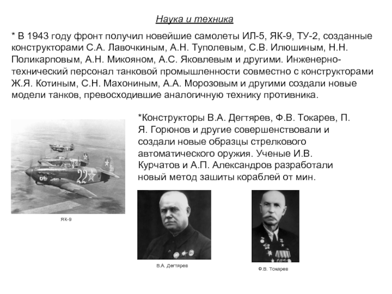 *Конструкторы В.А. Дегтярев, Ф.В. Токарев, П.Я. Горюнов и другие совершенствовали и создали новые образцы стрелкового автоматического оружия. Ученые И.В. Курчатов и А.П. Александров разработали новый метод зашиты кораблей от мин.