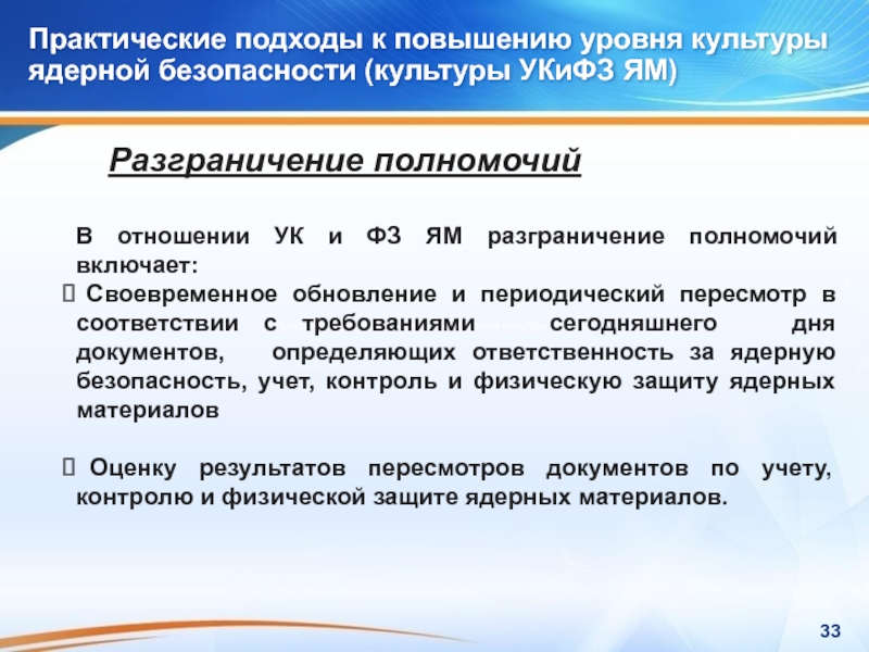 Слайд 33Практические подходы к повышению уровня культуры ядерной безопасности (культуры УКиФЗ ЯМ)