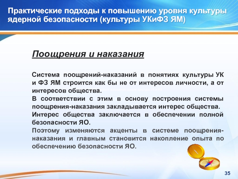 Слайд 35Практические подходы к повышению уровня культуры ядерной безопасности (культуры УКиФЗ ЯМ)