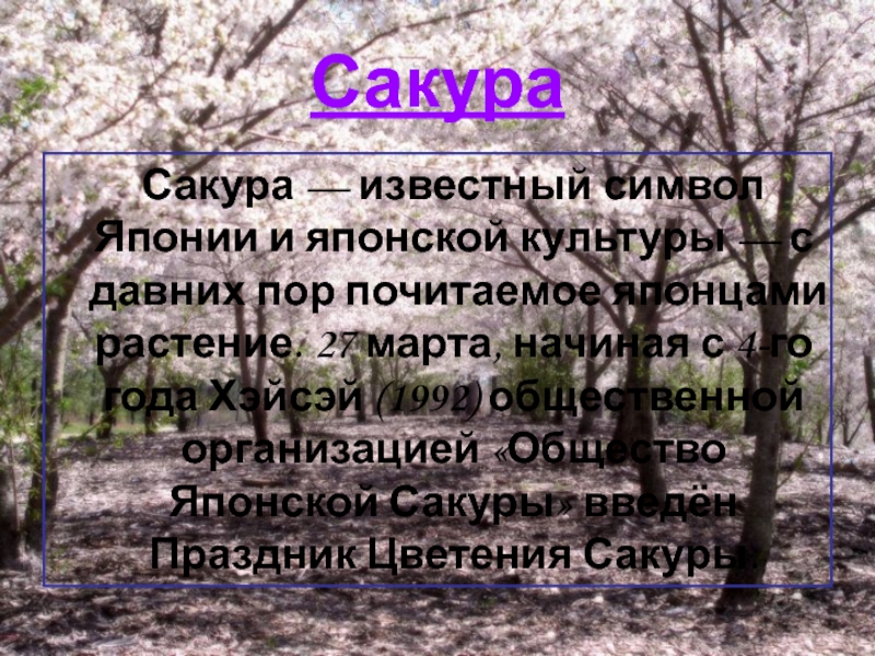 — с давних пор почитаемое японцами растение. 27 марта, начиная с 4-го года Хэйсэй (1992) общественной организацией «Общество Японской Сакуры» введён Праздник Цветения Сакуры.