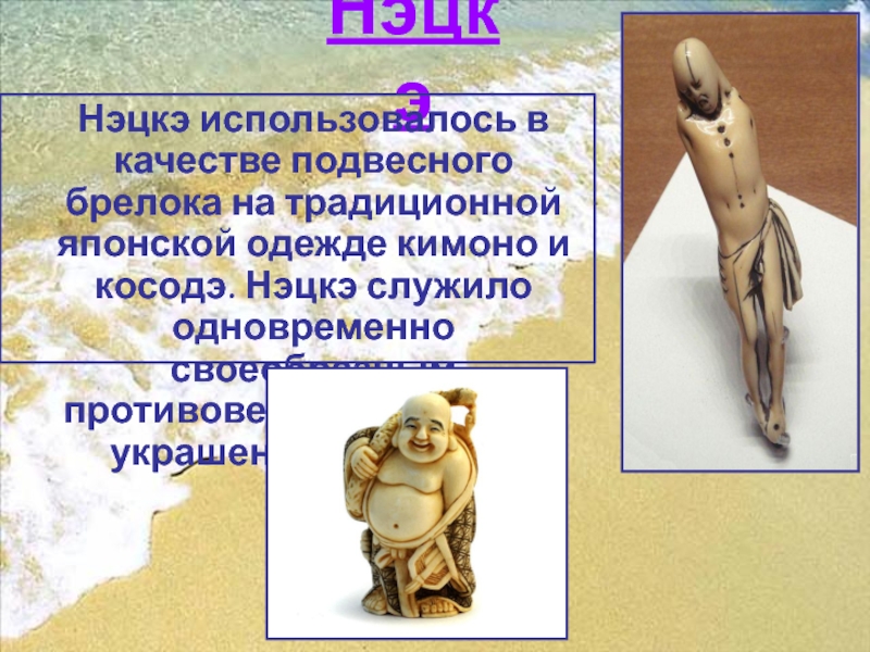 одежде кимоно и косодэ. Нэцкэ служило одновременно своеобразным противовесом и изящным украшением одежды.