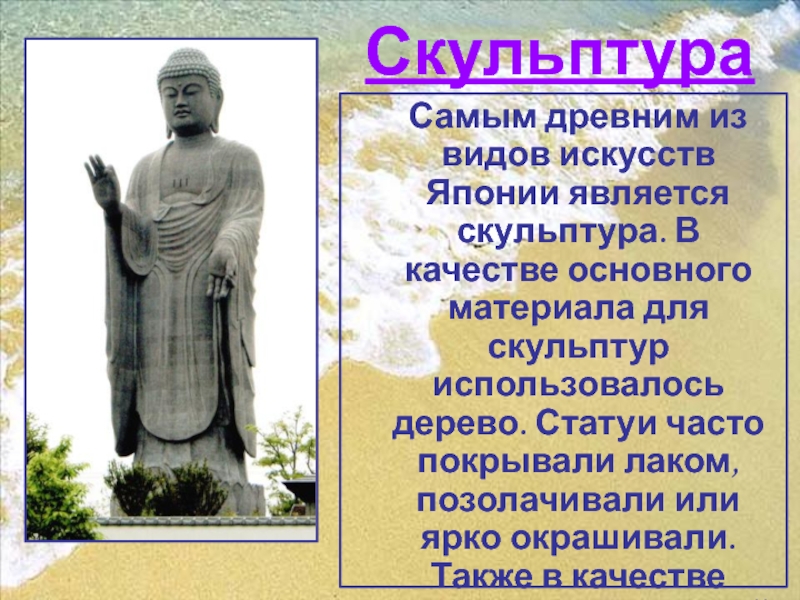 положение, особые природные явления (частые землетрясения и тайфуны), что выразилось в своеобразном отношении японцев к природе как к живому созданию. Умение восхищаться сиюминутной красотой природы, как особенность национального характера японца, нашло выражение во многих видах искусства Японии.