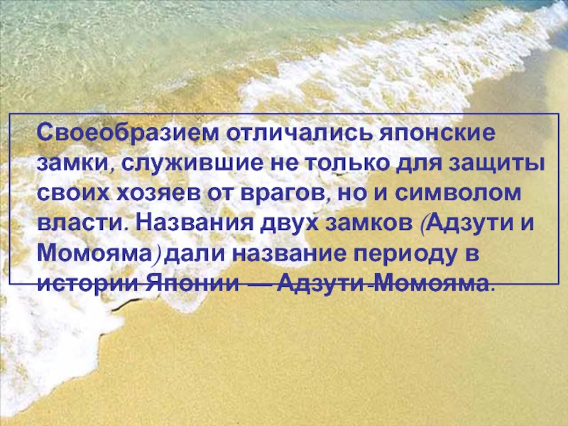 своих хозяев от врагов, но и символом власти. Названия двух замков (Адзути и Момояма) дали название периоду в истории Японии — Адзути-Момояма.
