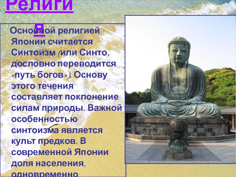«путь богов»). Основу этого течения составляет поклонение силам природы. Важной особенностью синтоизма является культ предков. В современной Японии доля населения, одновременно исповедующего две религии — буддизм и синтоизм, составляет 84 %.