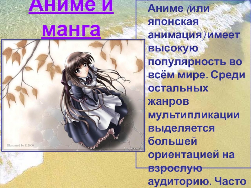 во всём мире. Среди остальных жанров мультипликации выделяется большей ориентацией на взрослую аудиторию. Часто аниме — это экранизации японских комиксов манга.