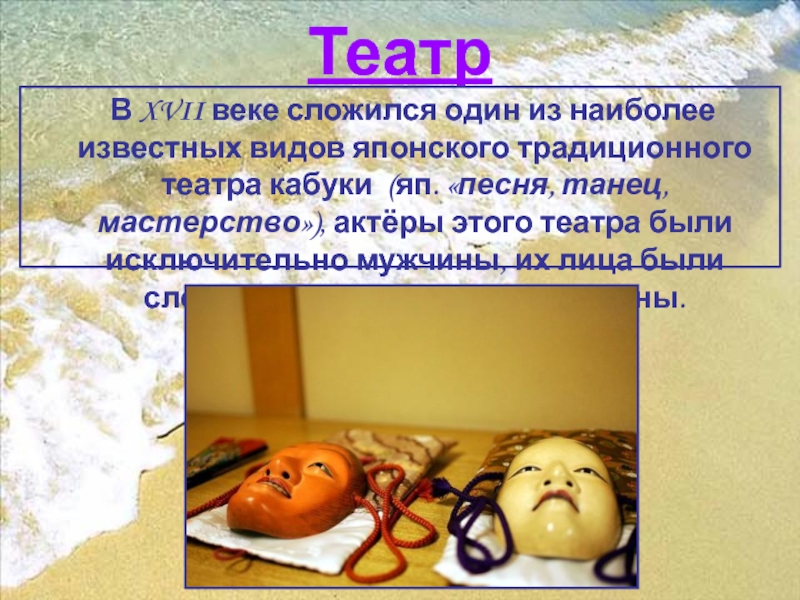 японского традиционного театра кабуки (яп. «песня, танец, мастерство»), актёры этого театра были исключительно мужчины, их лица были сложным образом загримированы.