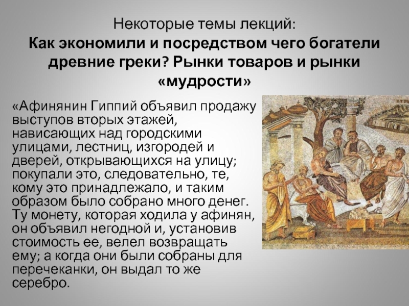«Афинянин Гиппий объявил продажу выступов вторых этажей, нависающих над городскими улицами, лестниц, изгородей и дверей, открывающихся на улицу; покупали это, следовательно, те, кому это принадлежало, и таким образом было собрано много денег. Ту монету, которая ходила у афинян, он объявил негодной и, установив стоимость ее, велел возвращать ему; а когда они были собраны для перечеканки, он выдал то же серебро.